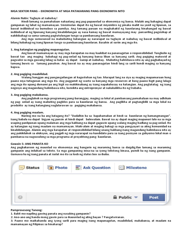 Mar 22, 2021 · ii. Korapsyon,polusyon,kakulangan sa mga pasilidad sa ibat ibang sektor ng pamahalaan tulad sa edukasyon, sa mga ukol sa pangkalusugan tulad ng ospital, health centers clinic, ang utang ng pamahalaan sa ibang bansa, ang pagtaas ng mga bilihin at kung tumataas nga ba ang ekonomiya ng bansa, ang kahirapan,populasyon at higit sa lahat ang napapanahong pagpatay ng isang nilalang. Hindi sapat na batayan ang paglago ng ekonomiya upang masabing ganap na maunlad ang bansa. Bagaman kadalasang magagamit, dapat tandaan na ang gdp ay tanging nagsasama ng gawaing ekonomiko kung saan. Bawat pilipino, matatamasa ang pagkakataong makabahagi sa pagpapalago ng ekonomiya at makinabang sa mga bunga nito. Nov 03, 2018 · b. Layunin din nito na gawing mas maunlad ang pamumuhay ng ating mga kababayan mula sa summer capital ng bansa. At isa din itong instrumento upang maging maunlad ang isang bansa. Puna … n ng tamang sagot ang tsart. Suriin ang pagkakaiba at pagkakatulad ng mga karanasan ng mga bansa sa silangan at timog silangang asya na sinakop ng mga kanluranin. Ang sektor ng agrikultura ay ang tagapagtaguyod ng ekonomiya ng bansa, at dito nagmula ang mga pagkain na tumutugon sa pangangailangan ng mga mamamayan ng isang bansa. Kailangan na ang pagbabagong ito sa charter ng baguio upang makasabay sa makabagong panahon. Suriin at busisiin ang mga patakarang pambansa ng dalawang bansang may parehong antas ng gni per capita ngunit magkaibang resulta hinggil sa.